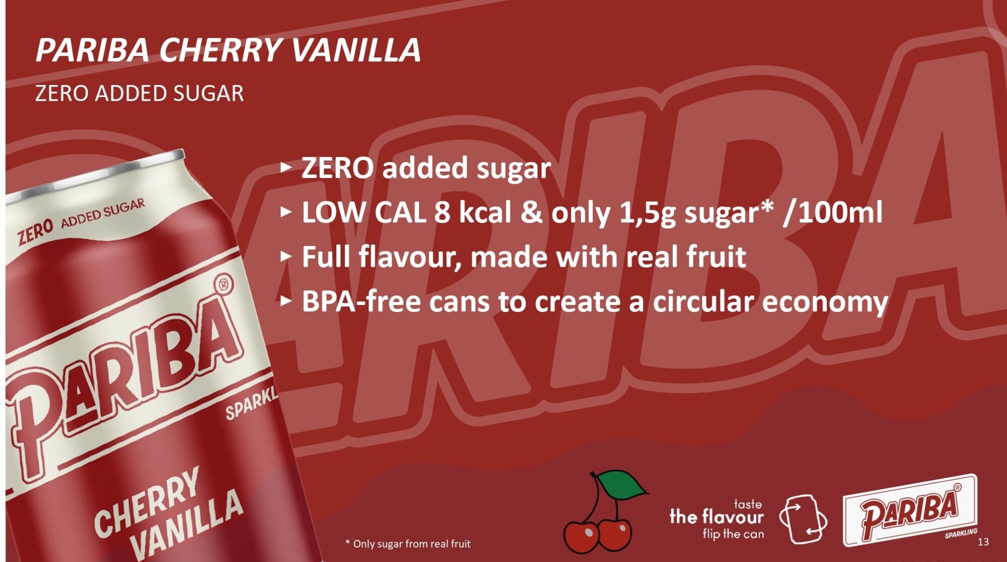 Pariba Cherry Vanilla is een verfrissende koolzuurhoudende frisdrank die de gedurfde smaak van kersen combineert met een vleugje vanille. Deze frisdrank heeft een zachte en romige smaak, zonder toegevoegde suikers. Geniet van de heerlijke combinatie van fruitige kersen en subtiele vanilletonen.
