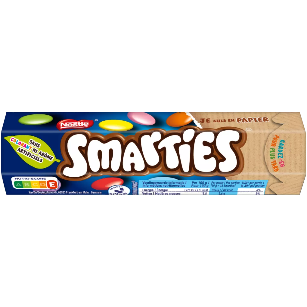 Smarties is an explosion of happy, colourful and crunchy chocolate candy. Smarties is Rainforest Alliance certified, sourced through Nestle Cocoa Plan.