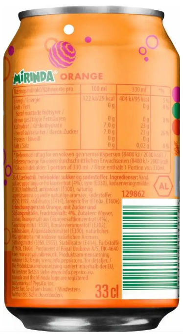 Zutaten: Wasser, Zucker, Orangensaft aus Orangensaftkonzentrat (4%), Lebensmittelsäure (E330), Konservierungsstoff (E202), Kohlensäure, Antioxidationsmittel (E300), natürliches Orangenaroma mit anderen natürlichen Aromen, Süßungsmittel (E950, E955) , Stabilisator (E414), Farbstoff (E160a E160c).